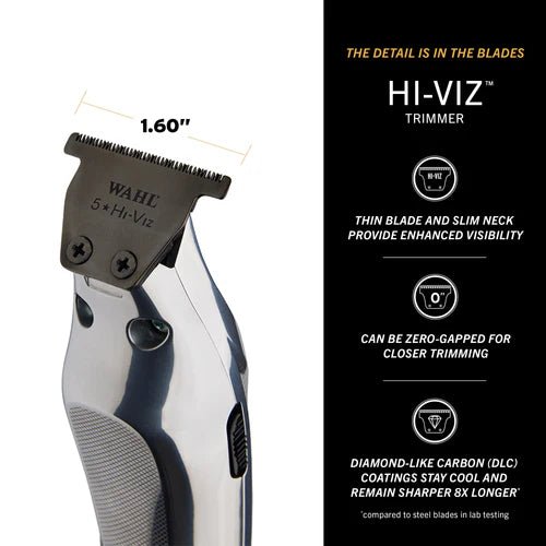 The Hi-Viz Trimmer was designed for those who live in the details. Built with a slim neck, where the body meets the blade, allows for more visibility and control with every cut. The re-designed wide T-blade is manufactured with diamond-like carbon (DLC) coatings that stay cool and remain sharp eight times longer than stainless steel blades (as shown in lab testing). With zero-gap capabilities, get skin close results and high-end results with every cut.