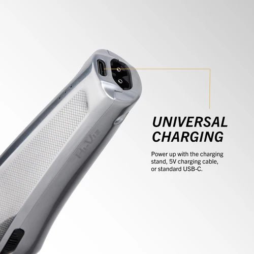 • Get 135 min of run time on a 45 min charge. Power up with weighted charging stand, 5V charging cable, or standard USB-C.